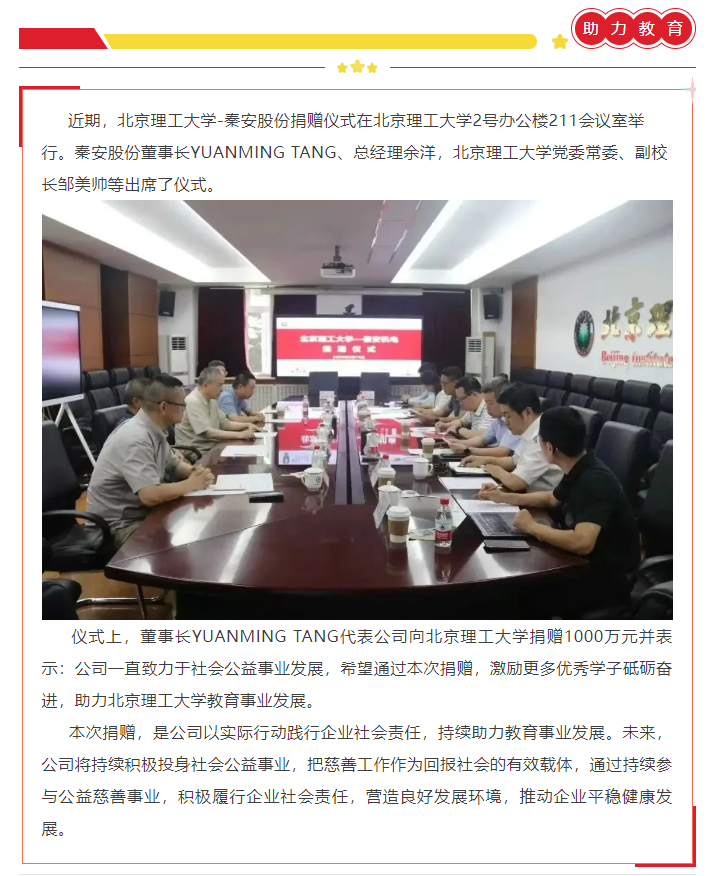 踐行社會責(zé)任,助力教育發(fā)展——秦安股份向北京理工大學(xué)捐贈1000萬元